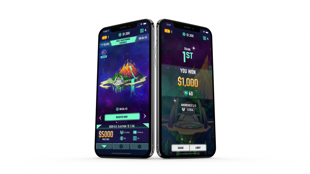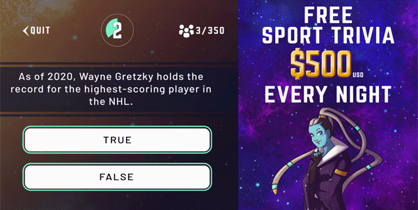 Once you download the app, you can play free contests that return small prizes or paid contests in which you can win more. The free contests are usually for a $10 prize that’s split among all players who answer three out of three questions correctly. There’s typically in the neighborhood of 250 players in a $10-prize freeroll, which means your expected win is only about 4¢ per play, but this is also no-cost entertainment. Every night there’s a sports-themed freebie with a $500 prize. These games attract closer to 600 players, so it’s worth about 85¢ to play and if you’re good at sports trivia, your EV will be higher. Note that these numbers describe your equity per game – when you win, you’ll bank bigger amounts, possibly winning up to $5 in the big contest. All questions are True/False.