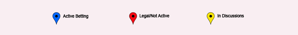 This map displays the current state of the legal sports betting landscape throughout the country. States without a marker have not yet conveyed serious intentions to explore entry into the market, although there may have been media coverage. Click on a marker in the map to access the most recent media accounts of progress toward sports betting legalization in each state.