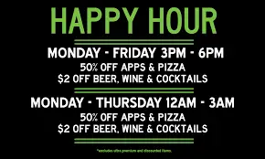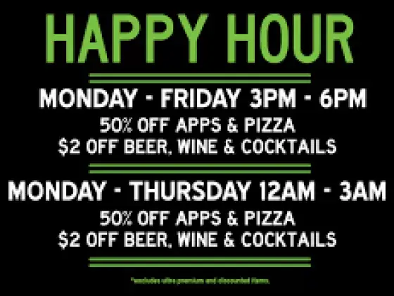 Aces & Ales Happy Hour at The Bend location open daily 4-6 PM and 12-2 AM offering $2 off cocktails, house wines, well drinks, all appetizers and 50% off all pizzas.