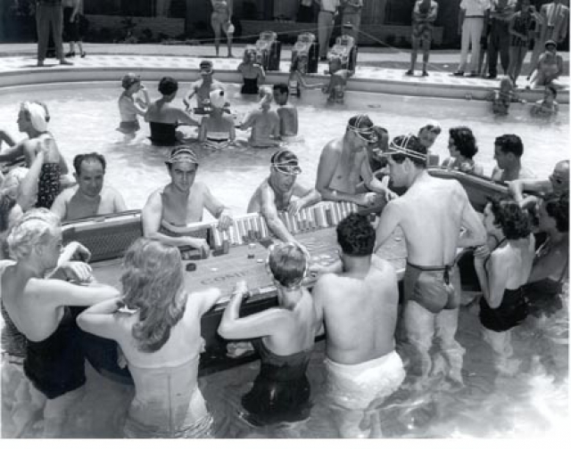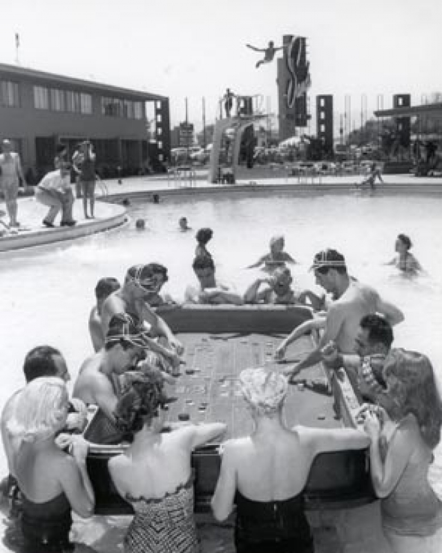 Although the Tropicana is credited with introducing swim-up blackjack, Las Vegas actually has a long history of in-pool gambling, dating all the way back to the summer of ’53. That’s when Al Freeman, the legendary publicist for the Sands, gained international notoriety by introducing floating blackjack, roulette, and craps, not to mention pool-side slot machines. The scene was famously captured on film by photographer Don English, who in 2002 recreated this classic Las Vegas publicity shot at the Stratosphere’s pool to commemorate the property’s $75 million expansion. Hotel guests, employees, and cast members from American Superstars were used to copy the poses of the original 1953 photograph. This picture is now on the wall of the Stratosphere’s vintage Vegas-themed Lucky’s Café.