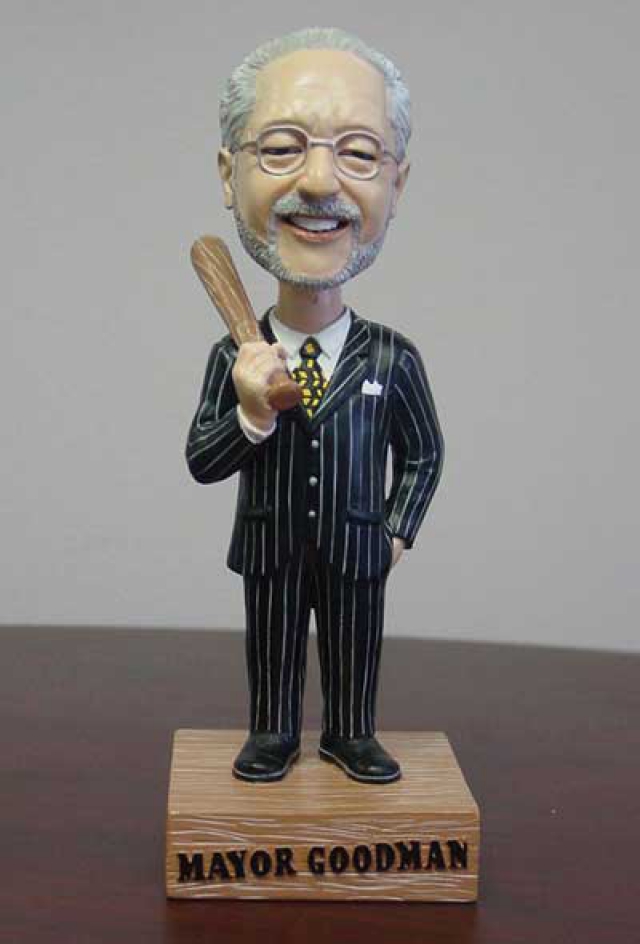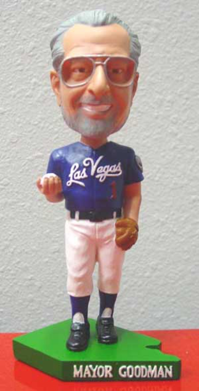 - A 2002 likeness produced to promote Cashman Field and the Las Vegas 51s baseball team depicts the mayor in a pinstriped suit, standing on something resembling a soap box and brandishing a baseball bat. As with all the Goodman Bobble Heads, this was never available commercially; it was only given away as a promotional piece at a game in July 2002.