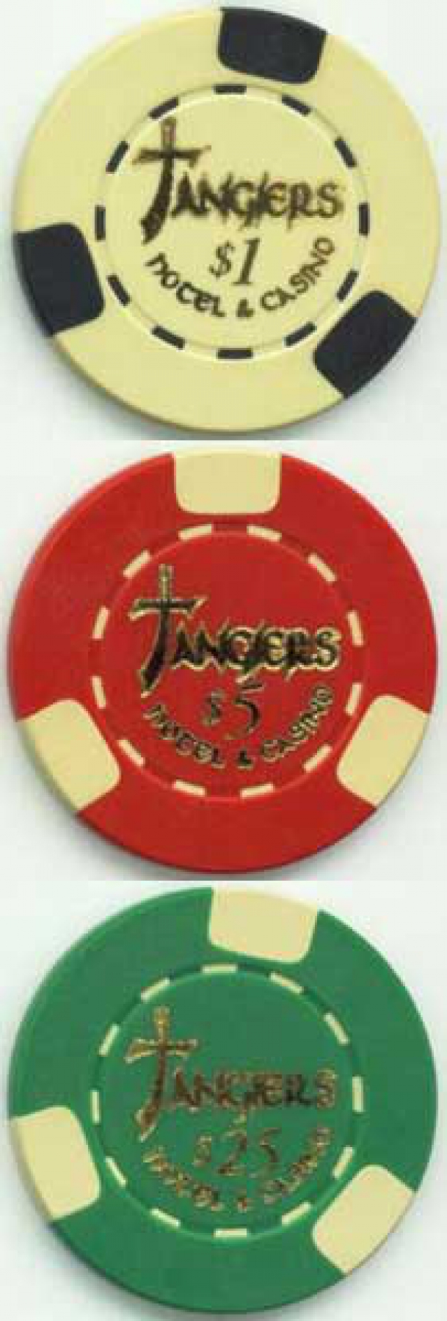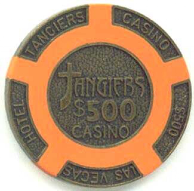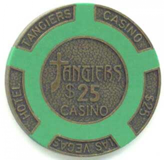 Although there’s no real bricks-and-mortar property called the Tangiers, you can purchase novelty Tangiers playing cards and chips, inspired by the movie, for home use. Weighing in at almost 16 grams each, the full-metal poker chips are the heaviest on the market. Fashioned from solid brass, they have a diameter of 39mm and are available in $1, $5, $10, $25, $100, and $500 denominations from many sites, including www.oldvegaschips.com, which kindly supplied the photographs below. The chip on the left is a clay-composite prop chip from the actual movie and is much harder to come by than the brass ones.
