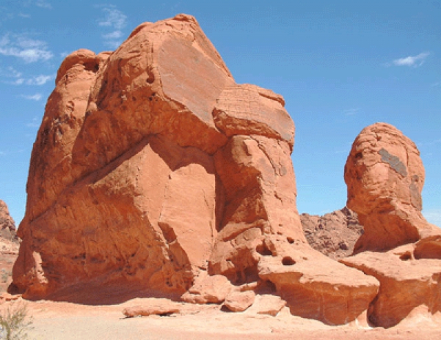 Unlike Red Rock, where uplift forced the older limestone over the sandstone, at Valley of Fire, the sandstone remains exactly as it was stratified, and the red rock provides an incomparable lesson in erosion. One of the best and most photographed examples is along the park road just beyond the eastern entrance, at Elephant Rock. Farther along, the Petroglyph Trail Visitors Center has a fabulous setting, nestled at the foot of a mountain of fire. Be sure to check out the Cabins, Petroglyph Canyon Trail, Mouse's Tank, Rainbow Vista, Silica Dome, the Seven Sisters, the Beehives, and Atlatl Rock. The back campsites at the two campgrounds are some of the most appealing in the state.
