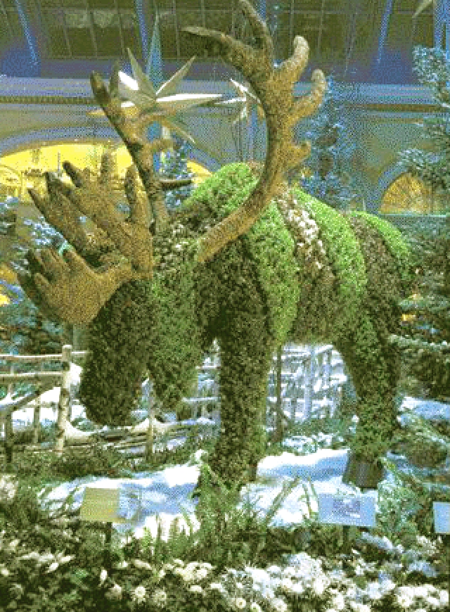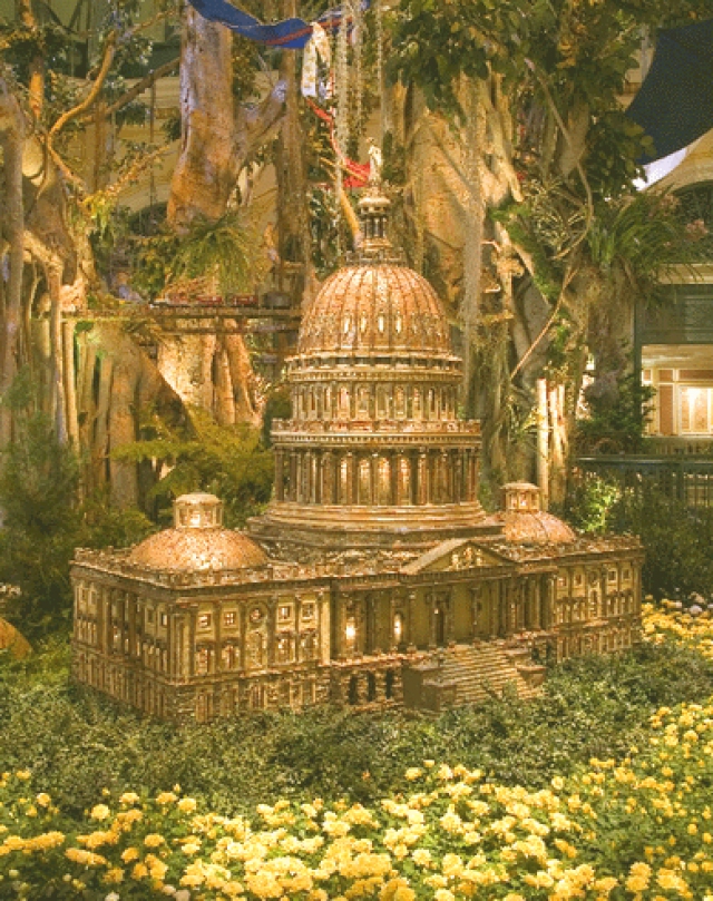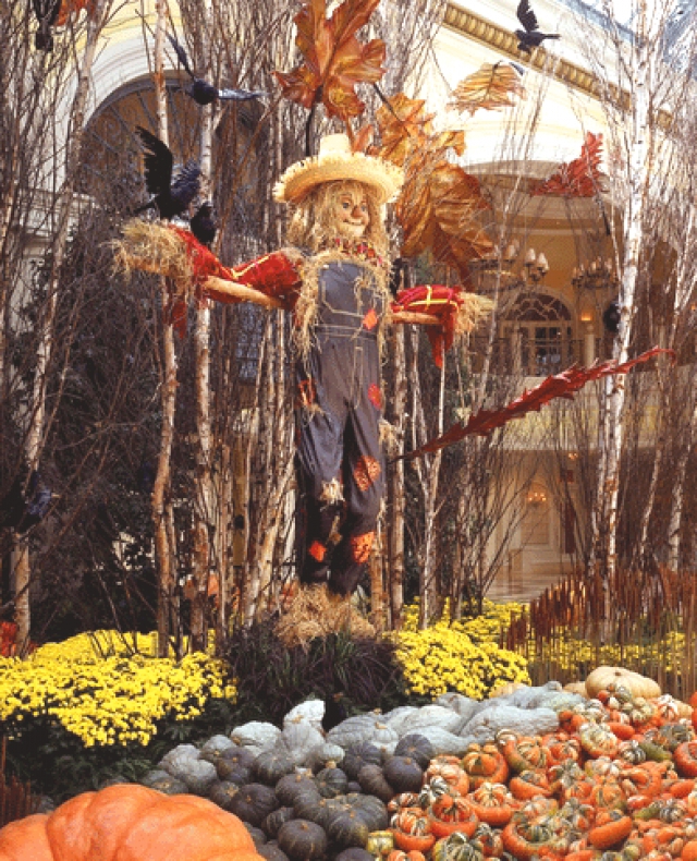 The Bellagio conservatory changes its display five times a year — once for each of the four seasons, plus again for Chinese New Year. Each new setup involves completely different plants and trees and a totally new "theatrical presentation" of the various elements, which include not only the living components, but also the gazebos, bridges, and various water features that can be added or removed, plus appropriate embellishments that create the desired seasonal ambience. On average, it takes the horticulture staff, which numbers approximately 140 men and women, seven days, working round the clock, to switch out each display. They don't close the conservatory during this time, so if you're lucky enough to be there at the right time, you can watch a new creation being put together. However, they do close certain aisles so there's enough room for workers, plant materials, and mechanical booms and lifts to operate, while keeping the public out of harm's way.
