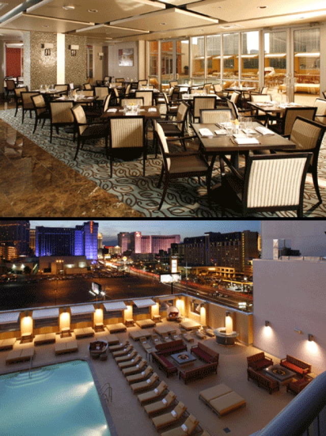 A block east of the Strip is the new non-gaming condo-tower/hotel, Platinum, which has a fifth-floor restaurant and bar that's separated from the pool deck by a wall of glass and offers impressive indoor and outdoor views of the southern and center Strip. There's also a semi-private dining area that can be booked for groups of up to 25.