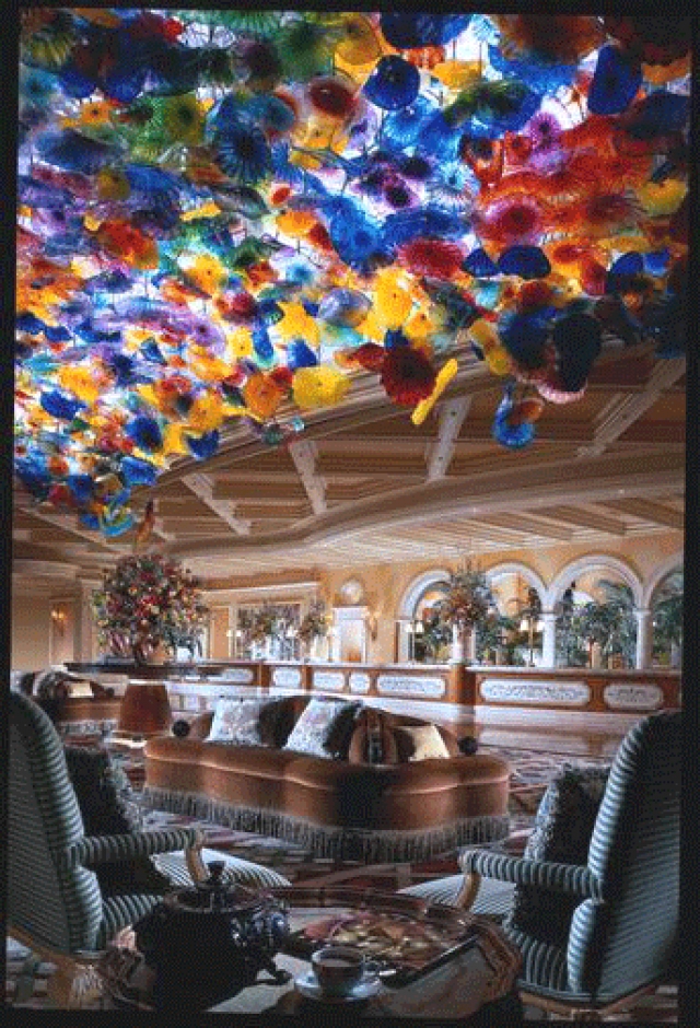 As long-time collectors of Dale Chihuly's art, the Wynns commissioned the world-renowned glassblower to create his single largest work to date, with Steve making numerous visits to Seattle to personally collaborate with the artist during construction.