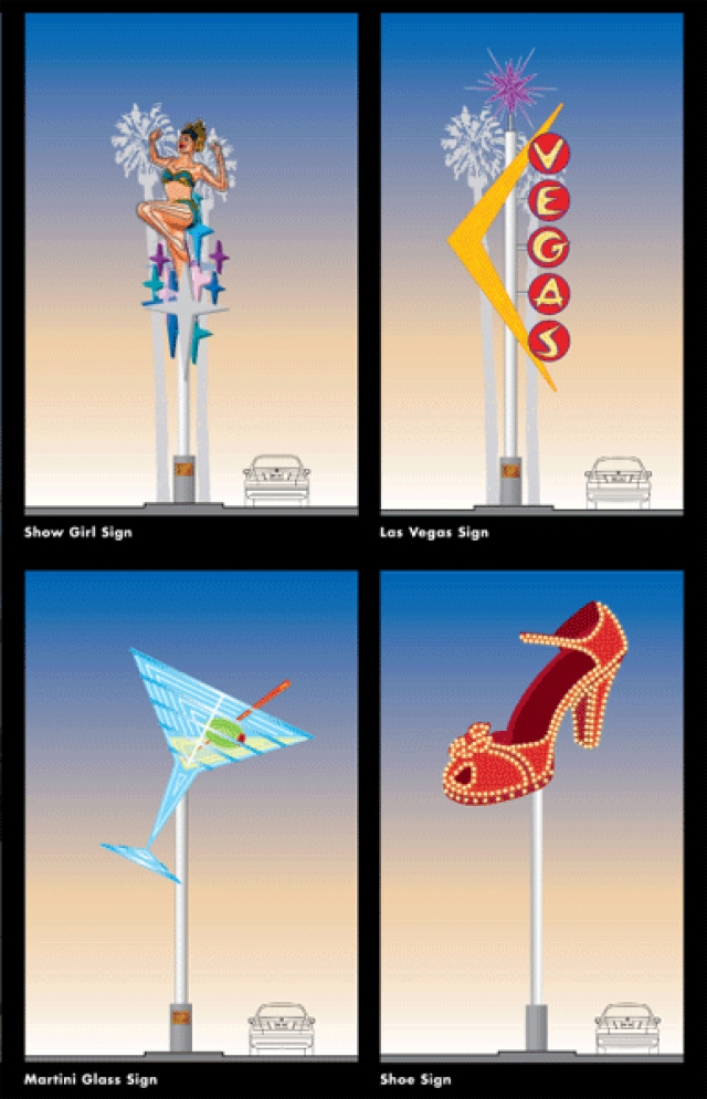 In addition, landscaping, lighted gateways, commemorative historical sidewalk medallions, and 40-foot-tall retro neon signs have been installed: a red stiletto-heeled shoe rotates 360 degrees; there's also a buxom beauty in a neon bikini and a colossal martini with an olive and swizzle stick.