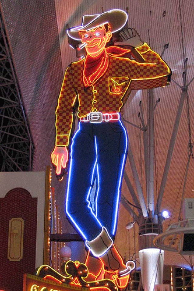 We too have long heard the rumor that Marvin shot at Vegas Vic with a bow and arrow while he was filming the movie The Professionals at Valley of Fire State Park in 1965. The story goes that Marvin, who was staying in a room at the Mint across the street, grew so enraged at the constant "Howdy, pardner," issuing from Vegas Vic that he took a little target practice at the Neon Cowboy's voicebox.