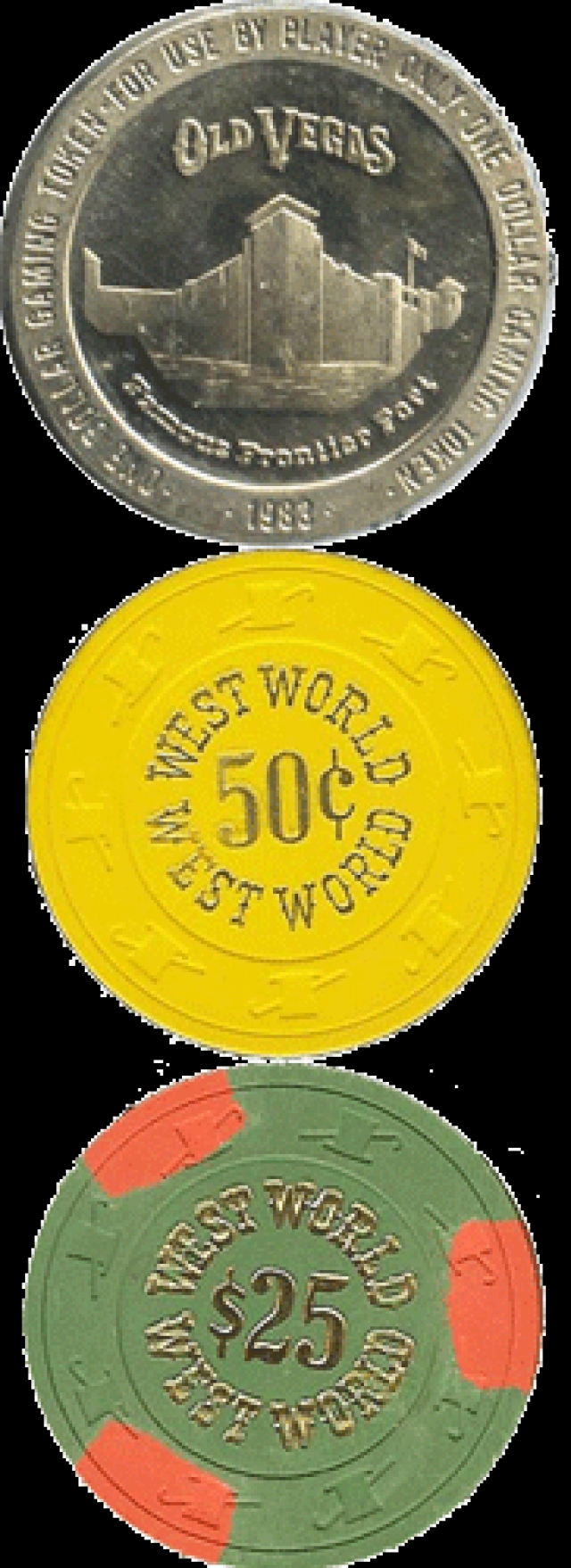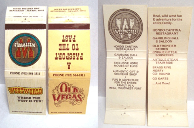 Whether the ranch was ever operational or was built purely as a set, we've been unable to ascertain. Either way, it didn't get much shooting action, as it was bought by a company that operated an amusement park in Arizona called Old Tucson (also used for TV and movies). Just before opening, the company that owned the site changed its name from West World to Old Vegas, to coincide with their other property. However, as we understand it, the company didn't bother replacing the chips they'd already made to reflect the new name (and only half-fixed the sign -- see the photograph below). Hence, we don't know of any Old Vegas chips, although members of thechipboard.com have kindly provided us with photographs of some West World ones, plus a $1 slot token that does say Old Vegas, and two matchbooks, one from West World and one from Old Vegas, which share the same phone number and most of the same information inside.