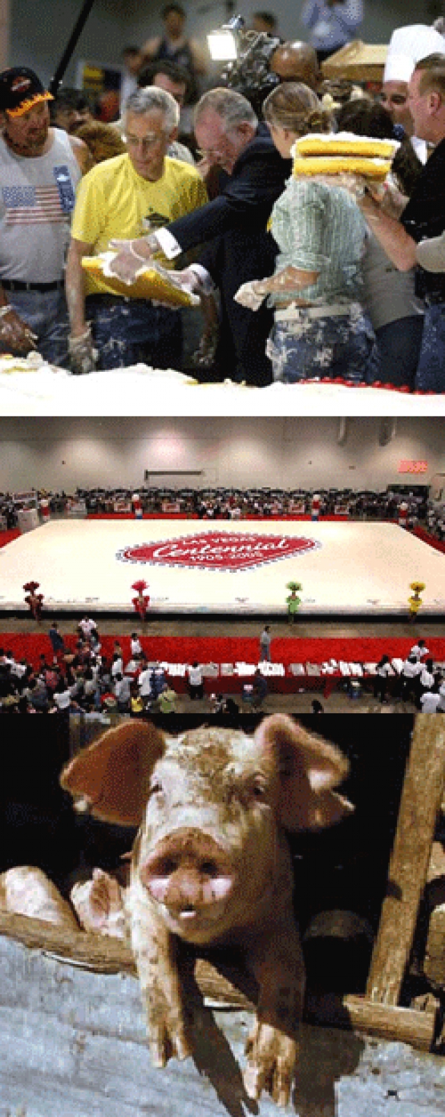 - The Las Vegas centennial celebrations downtown in 2005 featured the world’s largest cake. The seven-layer, 20-inch-high, 102-foot-long, 52-foot-wide 130,000-pounder consisted of 24,000 pounds of flour, 18,000 pounds of sugar, and 130,000 pounds of eggs, and more than a hint of miscommunication. Yes, the giant gâteau, which was delivered from Sarah Lee’s North Carolina baking facility in seven refrigerated semi-trucks, was thought to be a generous donation from the doyenne of desserts. Sarah Lee company officials, on the other hand, explained that they’d merely intended to offer the cake at a bargain $95,000 discount price. An unfortunate committee worker ‘fessed-up to being responsible for the mess-up and the Las Vegas Centennial Celebration Committee had to eat the bill. The cake, on the other hand, was lalargely consumed by the grateful residents of North Las Vegas’ pig farm (my, what an eclectic diet they have – cake one day, Jack O-Lanterns the next, not to mention the steady stream of buffet leftovers).
