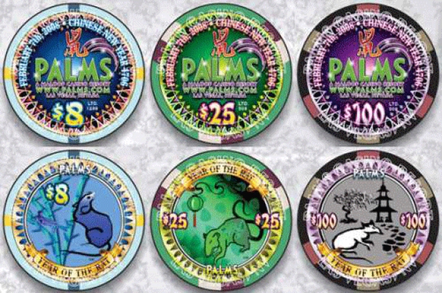 Bally's, Four Queens, Harrah's, Las Vegas Hilton, and the Rio, which all have in the past, inform us that they won't be producing chips for this Chinese New Year. So that leaves: MGM Grand, which will be releasing lucky $8 chips "sometime in the week of February 4"; the Palms, which released special $8, $25, and $100 denomination chips (see below) at 10 am on Jan. 31; and Wynn, which is releasing its $8 chips on Feb. 10.