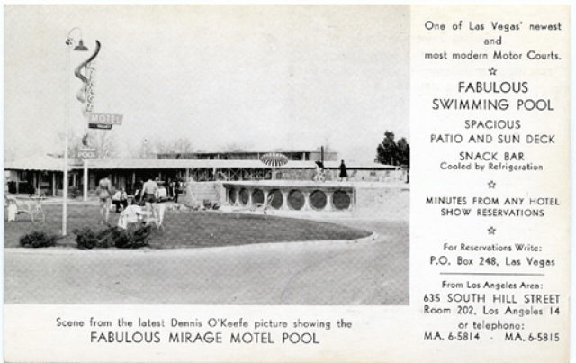 When this 22-room motel was opened in 1952 at the far south end of Las Vegas Boulevard, it was called the Mirage. Bob and Betty Rosoff bought the motel in 1953 and built the distinctive pool in 1955. The eye-catching portholes looking into deep blue water was not only the first landmark seen by sweaty visitors driving in from southern California (it predated the Welcome To Las Vegas sign by four years), it was also Las Vegas’ original water attraction. The pool was meant to beckon, like a mirage, to travelers wrung out by the heat of the Nevada desert. When they got to the landmark glass pool, the Las Vegas fun could begin.