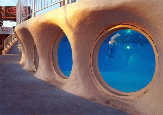 Right you are. It was called the Glass Pool Inn and its eponymous "glass pool" was aboveground, 26 feet wide by 55 feet long and nine feet deep, with eight steps on both sides of the pool to climb up to the deck. It was kidney-shaped, held 55,000 gallons of water (about twice the size of a large backyard pool, and featured seven four-foot-wide porthole-like windows that faced the Strip.