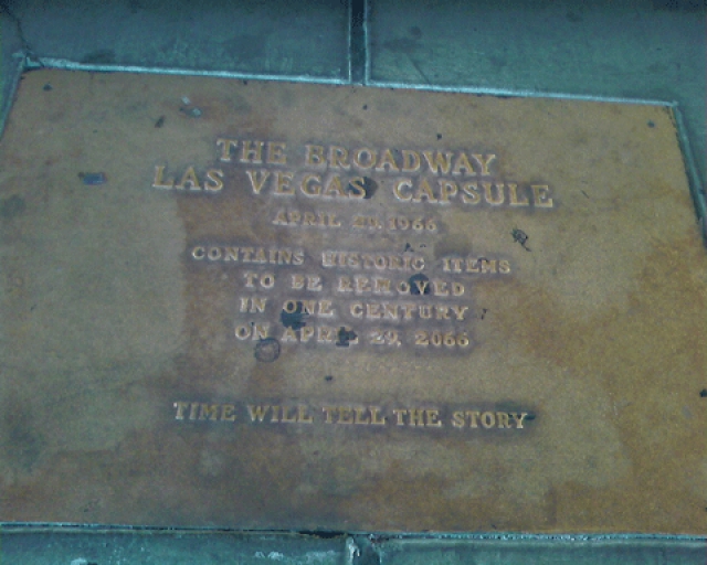 Photographs appear courtesy of Stephen Hendee ("Monument to the Simulacrum") and Jason Damas of www.labelscar.com, an interesting Web site and blog dedicated to the history of America's shopping malls and the current state of retail, who kindly drew our attention to the Broadway capsule and supplied the photo of the plaque. We'd also like to thank Friends of Classic Las Vegas, a non-profit organization dedicated to preserving Las Vegas history, buildings and landmarks, whose Web site was a great source of information in the researching of this answer.