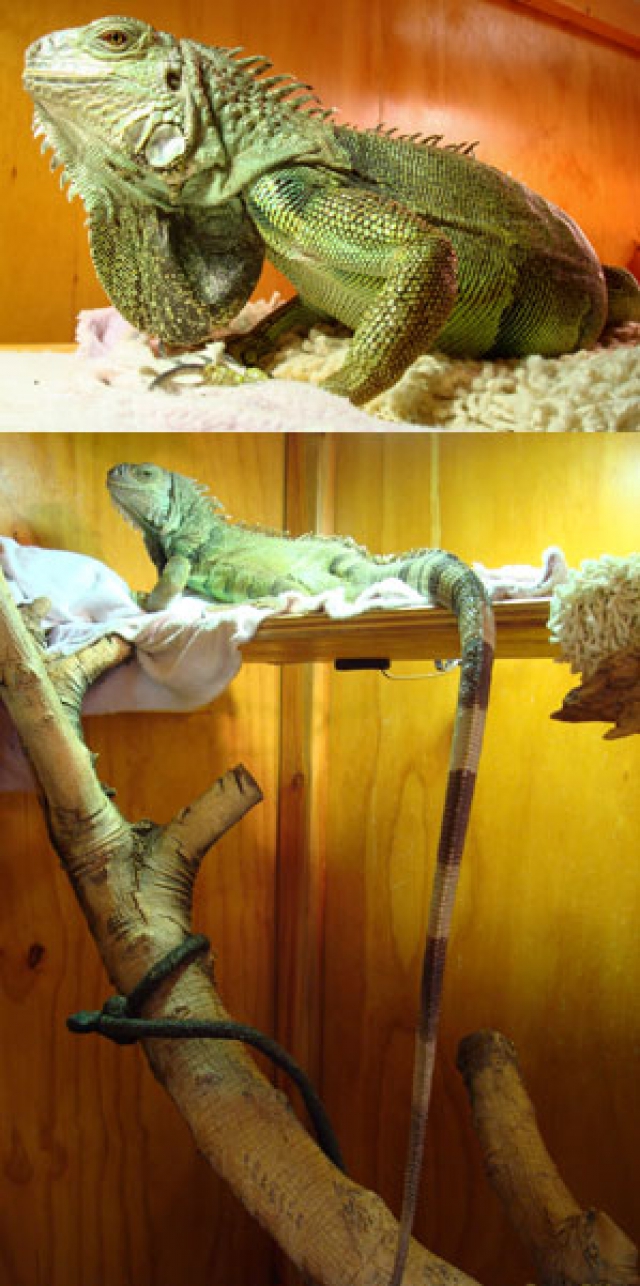 Of course, for those of you who don't know, we have an extremely handsome lizard of our own at HP, namely Mojo the Green Iguana, pictured below in all five feet or so of his glory. Far more exclusive than the Komodo, he's seldom disposed to public viewing, although he'll make an exception if you bring him some raspberries.