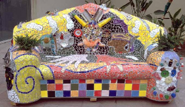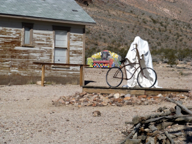 There are also a 24-foot steel prospector with his pet penguin; a mish-mash of chrome auto-body pieces (said to be "blossoming"); a colorful "sit-here" couch; a "winged woman" set atop two tall utility poles ("Icara," a female counterpart to Icarus); a "ghost rider" (one of Szukalski's ghosts holding a bicycle); and whatever temporary art has been set up out there. The Red Barn Art Center is an artist-in-residence facility between the museum site and Rhyolite where occasional goings-on include sculptors setting up stuff. There's also a rundown shack amidst the sculptures that was supposed to be the museum visitor center, but I've never seen it open -- fitting for a Ghost Museum.