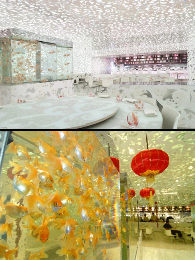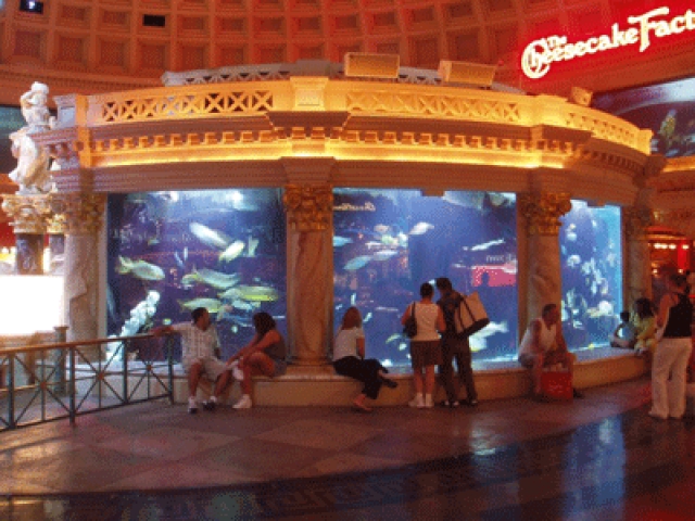 The newest addition we know of to the aquarium scene is again at Caesars Palace (which we hereby declare "Fish Tank Capital" of Las Vegas). The entrance to the relatively new Beijing Noodle No. 9 (good food but pricey) features six tanks each containing approx. 200 goldfish, which is pretty cool.