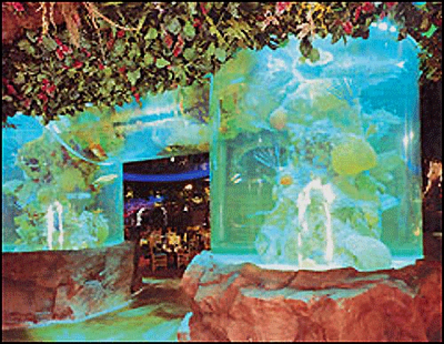 The Rainforest Cafe in the MGM Grand has an usual aquarium -- the 10,000 gallon saltwater tank is in the form of an archway, which you walk through to enter the restaurant.
