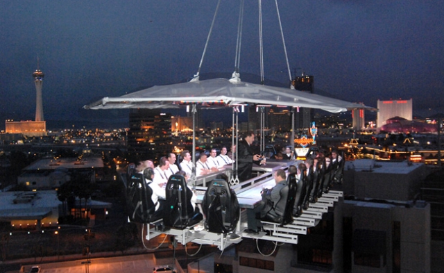 Alternatively, you could try the Dinner in the Sky option. This aerial dining concept was launched two-and-a-half years ago in Belgium and Las Vegas was the twenty-fourth city to get a crane-operated gourmet-dining experience. The table, which is suspended at a height of 160-180 feet, accommodates up to 22 guests and three staff (chef, waiter, and "entertainer").
