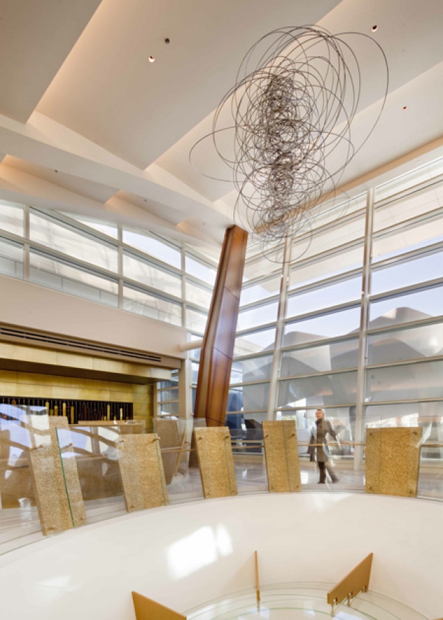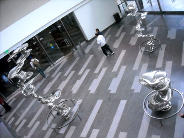 Well-known English sculptor Tony Cragg contributed three stainless-steel sculptures (one named "Bolt" for lightning; one named "Bent of Mind," and one unnamed) that look to us like liquid mercury frozen in space (think, Terminator); these are in the mini-lobby at the bottom of the escalator from the Aria self-parking garage.