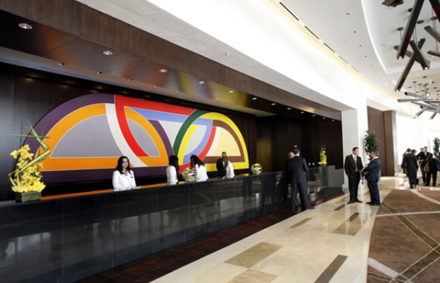 "Damascus Gate Variation" is an 8- by 32-foot canvas of colorful geometric shapes in flourescent alkalyd resin created by Frank Stella in 1969; this is found behind the Vdara front desk.