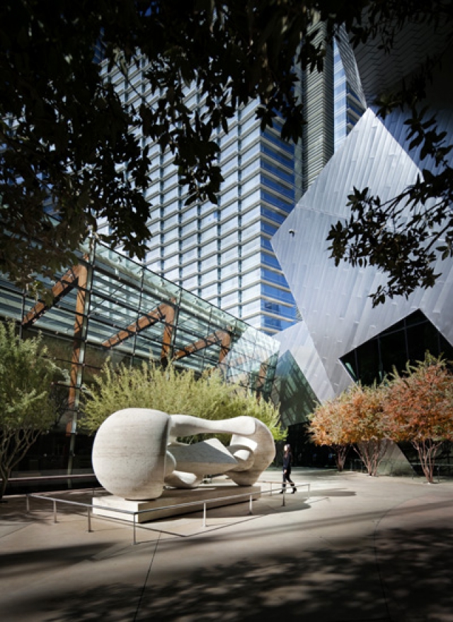 "Typewriter Eraser, Scale X," is a whimsical piece by Claes Oldenburg and Coosje van Bruggen is a 19-foot four-ton steel and fiberglass sculpture that looks like an old-fashioned eraser; it’s located at the porte cochere of Mandarin Oriental.