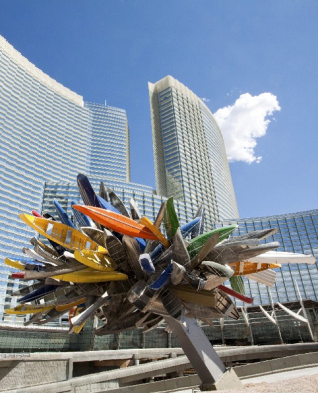 "Big Edge" is the Nancy Rubins’ 57-foot-wide by 75-foot-long by 20-foot-tall sculpture that combines 200 or so aluminum canoes and rowboats; it’s in the middle of the traffic circle between Aria and Vdara off Harmon Avenue.