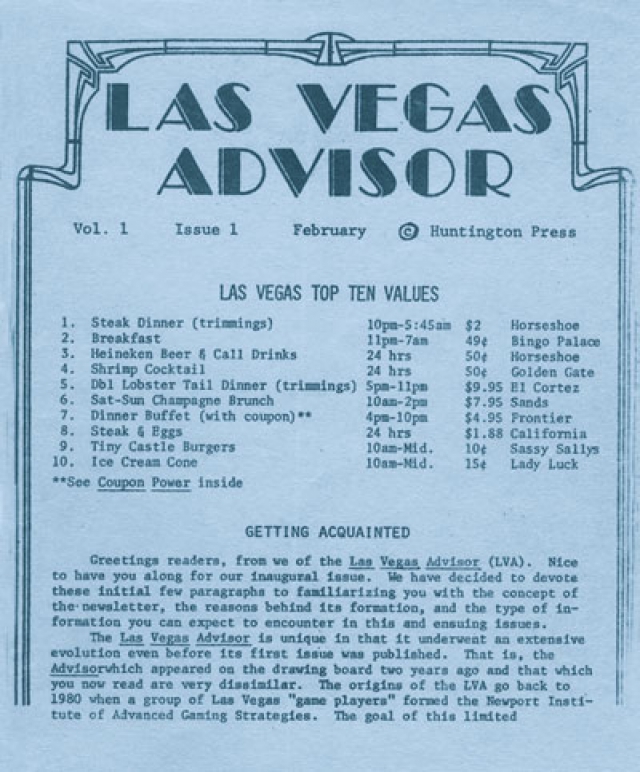 To answer your last question first, nobody can beg, buy, or bully their way into the Las Vegas Advisor Top 10 Values list, which has been a trademark of our newsletter since day one back in February, 1983 (see cover image below). The list is compiled by Anthony Curtis and his editorial team each month, based on what are perceived as being the best values to be found in Las Vegas that month. Although we tend to focus on less expensive deals, an offer doesn't necessarily have to be cheap, it just needs to be a bargain for the price it's being offered for.