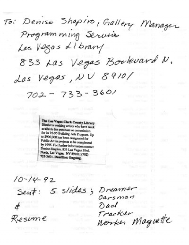 In 1992, David saw a Request for Qualifications listed in a professional magazine (ArtWeek?) by the manager of the Clark County Library, looking for artists to submit ideas for the $900,000-worth of funds they'd allocated for public art works (click the link below for a pdf file of the original, which David kindly sent us). He sent slides & a resume in response to that RFQ in October of 1992 -- and heard nothing. Nothing, that is, until over two years later.