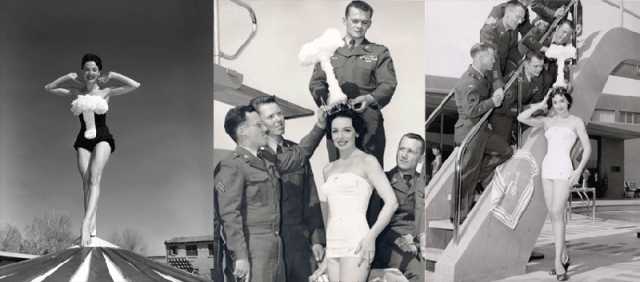 A showgirl at the Sands' Copa Room, Merlin became the iconic atomic pin-up, but she wasn't the first, nor the only one, we discovered. A little more than a year after the first bomb went off, the Last Frontier crowned Candyce King Miss Atomic Blast on May 9, 1952. Her photograph appeared in several newspapers around the nation, with one describing how she radiated "loveliness instead of deadly atomic particles" and "dazzled U.S. Marines who participated in recent atomic maneuvers at Yucca Flats." You can see her on the diving board at the Sands below.