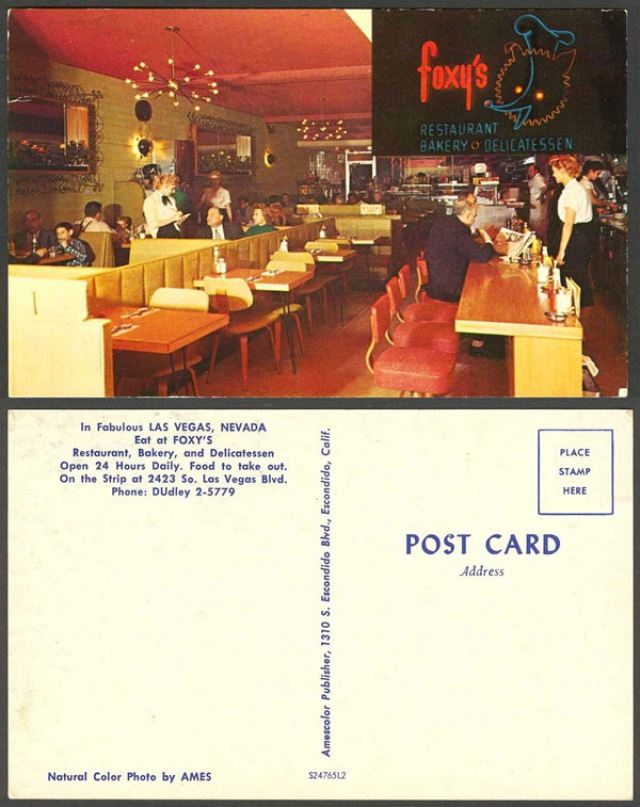 Abe "Foxy" Fox opened Foxy's Restaurant, Bakery, and Delicatessen (sometimes the names are listed the other way around) at 2423 Las Vegas Boulevard South when he arrived in Las Vegas in 1955. Notable for being among the first, if not the very first desegrated restaurant in Las Vegas, Abe opened Foxy's doors to all colors and recalled delivering meals to Nat King Cole when he was performing at the Thunderbird Hotel in the '50s. Fox even hired Cole to be his spokesman when, for some reason, he was campaigning to have Pahrump's name changed to Palm Springs. Beloved by performers including Sinatra, Wayne Newton, Ann Margret, Liberace, Don Rickles, The Mills Brothers, and Shecky Green, Foxy's was also a hangout for the good 'ole boys and numerous deals were said to have been inked on the back of a Foxy's napkin in the '50s.