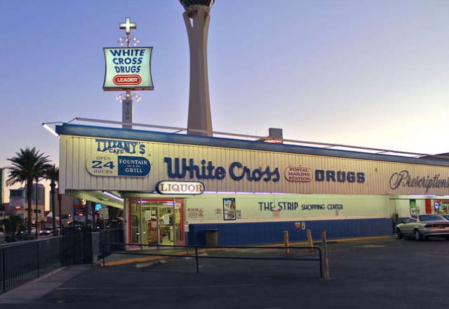 In 1964, the Four Queens bought the property and began construction on a new hotel and casino, at which point White Cross moved south down Las Vegas Boulevard to its final location at Oakey. Over the years, the building has welcomed everyone from the Rat Pack to Elvis, and from Liza Minnelli to Ludacris, not to mention countless showgirls, whether to fill a prescription or pick up some cosmetics or grab a bite at the diner, which exists within the same building but under separate ownership.