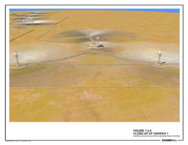 Located just inside the California state line, southwest of Las Vegas, the towers have been described as looking more like NASA rocket pads than heliostat receiving towers. Surrounding all three towers is a growing field of 340,000 7-foot by 10-foot mirrors that are being manufactured on site and arranged in arcs, asymmetrically, around the solar boiler towers. Each mirror tracks the sun throughout the day and reflects the solar energy to its receiver boiler.