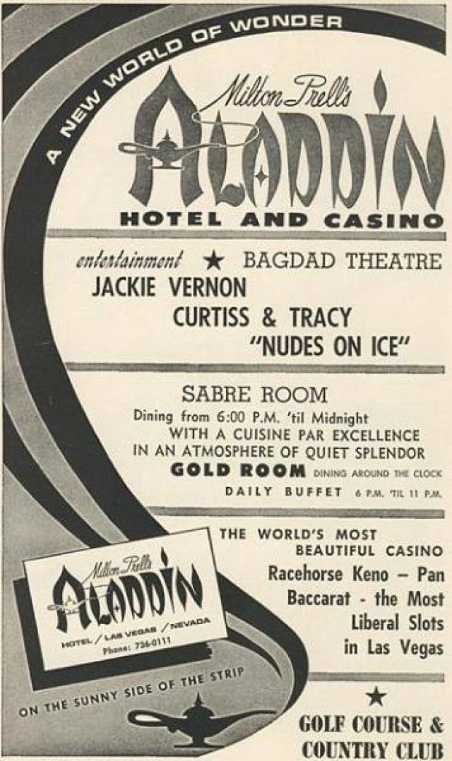 It was Nudes on Ice that tapped into the campy '80s zeitgeist, however, with its intriguing if inaccurate title (the girls were topless, not nude). Apparently affectionately known to cast members as "Boobs on Cubes," the show featured pro ice skaters and topless showgirls* (with varying degrees of ice-skating ability) and had performed at the Aladdin for awhile in the late '60s (see flyer). Most people associate it with its late '80s revival at the (Union) Plaza, however, where it opened in 1988 for a 12-week run and ended up playing for the next 18 months, closing in late 1990.