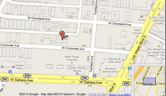 "The April 15, 2010 QoD involved Manuel Corchuelo's 700 sq ft home in Naked City. Using Google Maps Street View, I looked at the address you provided: 224 Cincinnati Ave. When the photo for Google was taken, there was a sign out front that said, "Rossum Realty Property For Sale. Resort Corridor, High Rent District. $20 Billion Of Approved Projects Surrounding Parcel. Accepting Bids For This Parcel." There was also the name Tom Bloss and phone number 702-429-4752. I don't know how old this sign is, but hopefully it will help out with finding out more about this QoD. Have a great day." [Ed: After an email like that, how could we possibly not?!]