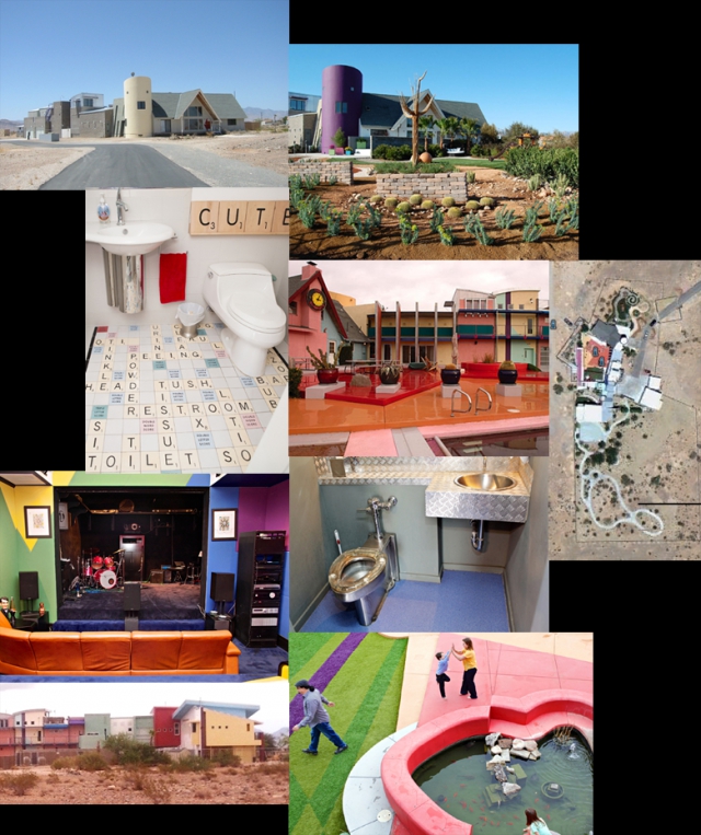 It was the austere east facade that formerly lived up to the deliberate "penitentiary" aesthetic, with its chain-link fence and OTT hi-tech security system that previously lived up to its nickname, the Slammer, in contrast to the whimsically colorful (so bright, you can see it from space! Well, at least from Google Earth...) "private" approach on the west side. There's nothing like a young family for shaking up the old bachelor pad, however, and the arrival of a wife and kids has had a notable "softening" effect on the exterior, as you can see from the "before-and-after" shots below.