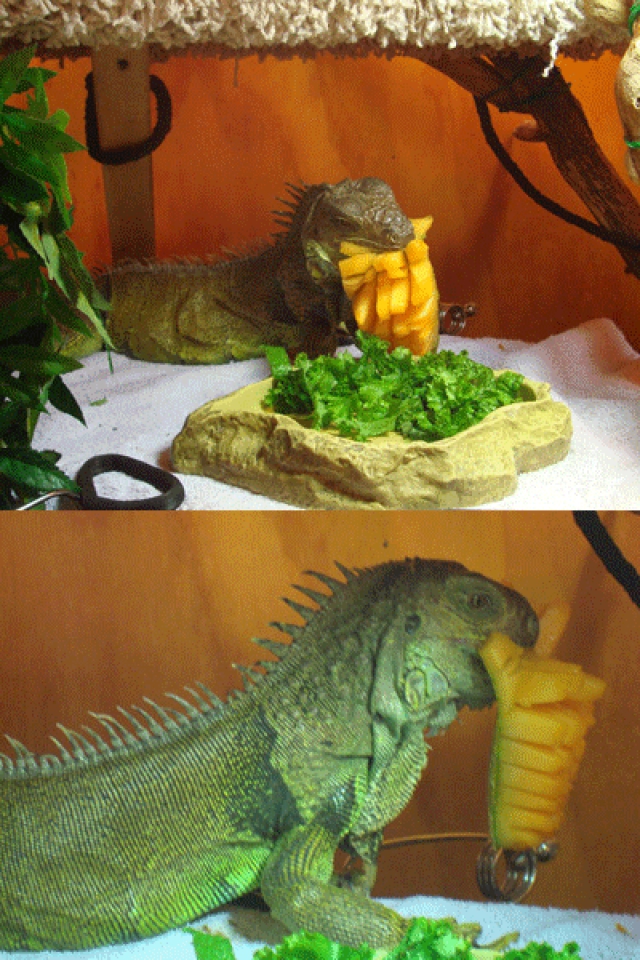 While we're on the subject of reptiles, for those readers who were intrigued by our office Green Iguana (some of whom even came to pay a special visit, including one brave but bald male LVA member, who allowed her to sit on his head!), we're very sad to relate that Mojo passed away last summer. She was almost 15 years old and had dodged death on more than one occasion, not least when "he" turned out, at age seven, to be an egg-bound "she" in urgent need of a C-section and a hysterectomy to remove 38 malformed eggs, an operation duly performed by Las Vegas' most awesome "exotic" vet (thank you, Dr Kolmstetter!)