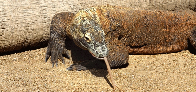 Indigenous to various Indonesian islands and the largest living lizard, dragons can reach up to three meters in length and 300 pounds in weight and they're not something you want to bump into on a dark night, or even on a sunny day, for that matter. As Wikipedia explains, "It is able to locate its prey using its keen sense of smell, which can locate a dead or dying animal from a range of up to 9.5 km (5.9 mi). Komodo dragons have been observed knocking down large pigs and deer with their strong tails." And here's more, from the Shark Reef site: "Patiently, it will lie and wait, sometimes for hours, for a suitable meal to approach. When the Komodo attacks, it aims for the feet of its prey first, to knock it off balance. Once the prey is down, the Komodo will use its razor sharp claws and dagger-like teeth to devour its kill.