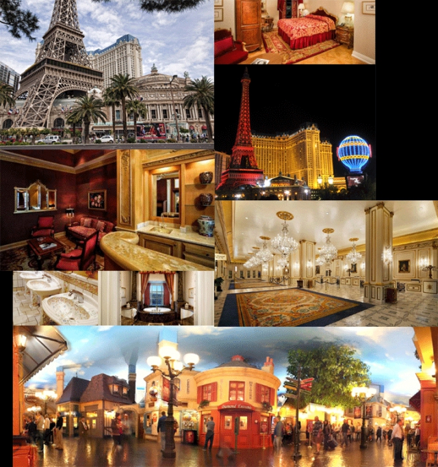 With a façade suggestive of the Paris Opera House and Louvre museum, featuring landmarks including a two-thirds-size version of the Arc de Triomphe and replicas of La Fontaine des Mers (since removed to make way for the now-defunct Sugar Factory American Brasserie) and the famous Montgolfier Balloon (extant, if having seeing much better days), complemented by a chandelier-studded hotel-casino and Rue de la Paix shopping district that today still features "cobbled" streets, those painted skies again, faux gas lamps, and stores with names like "Les Eléments" and "Le Necessities" and restaurants dubbed "Le Village Buffet" and "Les Artistes."