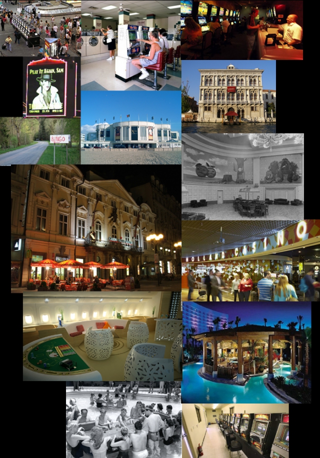 Images in the montage depict Australia's Desert Cave Hotel in Coober Pedy; the Casino di Venezia; Grande Casino Knokke; Swedish drive-in bingo; a Las Vegas topless gentlemen's club; Schiphol-Airport Holland Casino; McCarran International Airport; Hard Rock's Floating Palapa blackjack tables; the Sands' "floating casino"; Prague's Casino Palais Savarin; a "Trailer Station"; and AirJet Design's Casino Jet Lounge. We're just not telling you which is which...