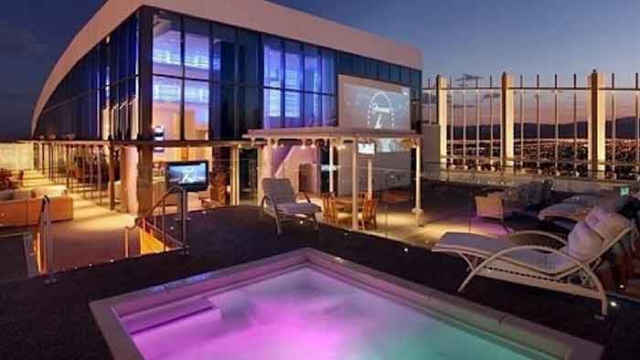 Accessed via a private elevator (naturally), the three-bedroom, five-bath penthouse comes with features including: 30-foot ceilings; a 20-person hot tub; 35 flat-screen TVs; a DJ booth; a wet bar; and an outdoor theater and kitchen. Boasting 360-degree views of the Las Vegas Valley, the penthouse is also often described as possessing its own private helipad, but according to sources including Vegas Inc., it's more accurately described as a "possible helicopter landing pad" (meaning that "with minor construction," it would be helipad-capable," according to Lisa Sutton of Synergy Sotheby's International Realty).