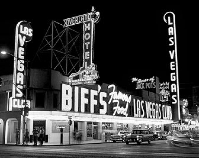 There’s a separate "Biff" angle to Fremont Street: In Back to the Future II, Marty McFly's nemesis, Biff Tannen, owned Biff Tannen’s Pleasure Palace Casino Hotel, whose entrance, tower, and lights bore a striking resemblance to the Plaza Hotel, directly across the street from the Vegas Club. (The Plaza was also owned by Gaughan and Exber for a time, until multinational conglomerate Tamares Group bought them out in 2005.) Thus, whoever named the restaurant at the Las Vegas Club "Biff's" was inadvertently clairvoyant. Either that, or whoever named the Back to the Future character knew a little something about an obscure moment in Las Vegas history.