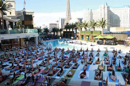Whatever one thinks of The Cosmopolitan of Las Vegas‘ business plan, the $4 billion resort seems bound and determined to position itself as a lifestyle-oriented hangout for the upwardly mobile, with casino gambling just one amenity among many others. But perhaps you looked out over the pool deck last weekend and thought, “Wow, that looks like the largest multi-day yoga festival in the world!” And you’d be right. It was something called Wanderlust and obviously drew a bevy of yogini. The jury’s still out on whether this kind of niche marketing will work but it has the virtue of apparently being previously untried.