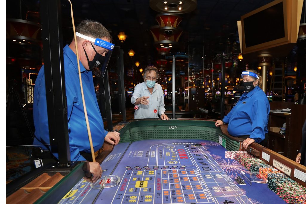 This was the scene yesterday at Resorts Atlantic City as the casino reopened for business. “Play Safe, Work Safe” is President Mark Gianantonio‘s motto, as he stressed (among other things) the number of outdoor-dining options available. He also name-checked a variety of vendors who did everything from electrostatic-spraying of the casino to installing anti-viral UV technology in the air-handling system. That’s what guests won’t be able to see. What they will includes mandatory mask-wearing, health screenings at every point of ingress, limited seating at table games (and only 50% of slot inventory in play) and readily available hand sanitizers, etc.