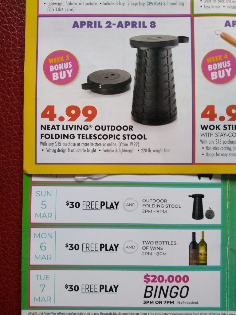 As we rummage through our mailbag, we find a number of dispatches from our East Coast correspondent, who recently helped prop up the Golden Nugget in Atlantic City with a three-night stay. He was drawn by a giveaway at Ocean Casino Resort (above): “They were having this odd gift of an ‘outdoor folding stool.’ Of course we had to have one. This week Boscov‘s (regional department store) had this ad showing the true value of the item: $4.99, with making a $15 purchase. I never knew the Illitch Family was so generous.” Throw in a mingy $30 of free play and it’s still not a George offer. That’s not how you get to number-one status, Ocean.