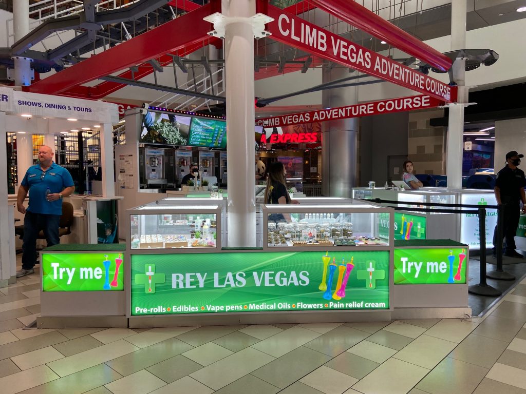 Hard by Planet Hollywood there’s a strip mall where you can get some egg rolls at Panda Express, satisfy a Big Mac Attack at McDonalds … and buy pre-rolled joints at the little boutique above. Legalized marijuana hasn’t infiltrated casinos yet, but it’s getting closer. (Addendum: Actually, it’s untruth-in-advertising. A source says Rey Las Vegas is just selling CBD product and the “Pre-rolls” is purely for show. Still, a sign of the changing times.)