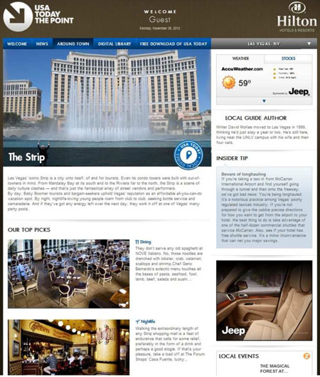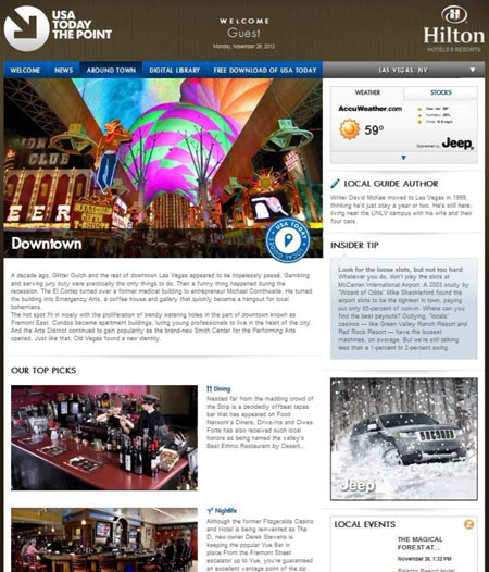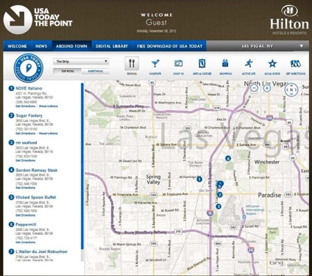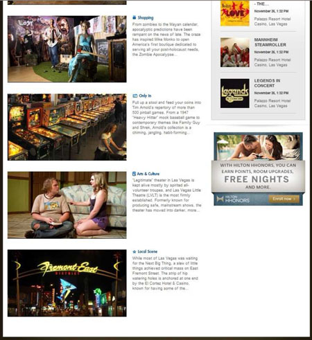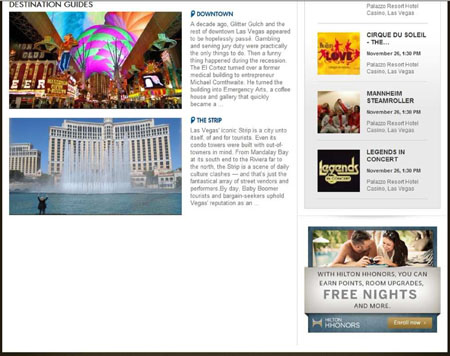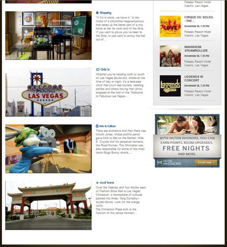 Here’s a handy guide to using the online Las Vegas guidebooks written by yours truly — sort of a tourist’s extension of S&G, available through all Hilton-branded hotels and timeshares. Since these only concentrate on carefully selected highlights of Sin City, there are merely supplemental to the truly comprehensive coverage provided by LasVegasAdvisor.com, but they can be taken as endorsements, not purely informational tidbits. You start by clicking on the green “Las Vegas” tab in the upper-right corner, which takes you to …