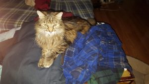 Leona is no more. She died in my arms at 3:15 this morning, having suffered an apparent stroke and breathing with great difficulty. We found her in the bathroom, having lost the use of her left front leg and in terrible distress. We took her to bed, where she expired, surrounded by those who loved her. Now she can romp in the fields of the Lord with her departed brother Rascal. Leona was always Kanga to Rascal’s ADHD Tigger: She demanded nothing more than to be petted (for which you were rewarded with deafening purrs) and some occasional kitty chow. She was also a regular presence during NFL games on Sunday, wedging herself between her Mom and Dad. Maybe her most endearing characteristic was her tendency to keep Jennifer’s head warm by sitting on it while we slept. Alas, no more “hats,” no more Leona. The Purr Monster has gone to a better place but we are all the sadder for it. At least she suffered little at the end and left this vale of tears with catlike speed. Not all of our felines have been so fortunate. Goodbye, Leona. (Portrait by Jennifer McKee.)