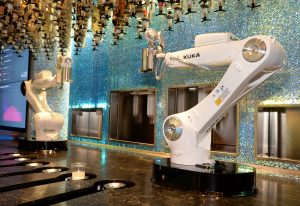 * At the risk of sounding like Sheldon Adelson fulminating against the invention of the McCormick reaper and the cotton gin, I must register some reservations about the concept of the Tipsy Robot, newly installed at Miracle Mile Shops. The two-robot bar, the brainchild of Rico Armeni (one of the best restaurant minds in town) will prepare your beverage of choice With all due respect to Armeni I’m not entirely sold on the concept. I’d like a bartender who takes more than 70 seconds to prepare my dirty martini and who is receptive to human input. Also, I’d have more confidence in the Tipsy Robot’s prospects if it wasn’t in Miracle Mile, one of the Strip’s dodgier malls. Still, with access to 72,000 prospective customers a day auguries for success seem good and perhaps the concept will spread further along the Strip. Still, I’d hate to see Rhumbar being run by robots.