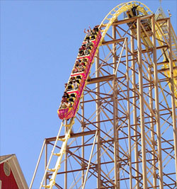 My birthday coincides with “Free Ride” day on the Desperado at Primm Valley Resorts. From 12:15 p.m. to 7:45 p.m., on August 16, you can be terrorized to your heart’s content. And terrifying it is: My wife and I tried the Desperado recently and found its whiplash considerably more violent than on our previous visit, in mid-2007. You can write me off as an old fogy if you like but the missus lurves her some roller coasters, the scarier the better. But the rattletrap condition of the Desperado really put the fear of God into her and not in a good way. She’s sworn it off permanently.